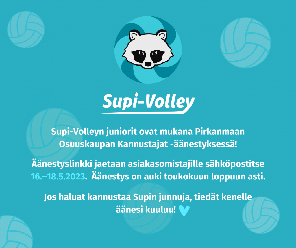 Supi-Volleyn juniorit ovat mukana Pirkanmaan osuuskaupan kannustajat -äänestyksessä, jossa jaetaan 35 000 euron tukipotti 20:lle eniten ääniä äänestyksessä saaneelle seuralle/yhdistykselle.